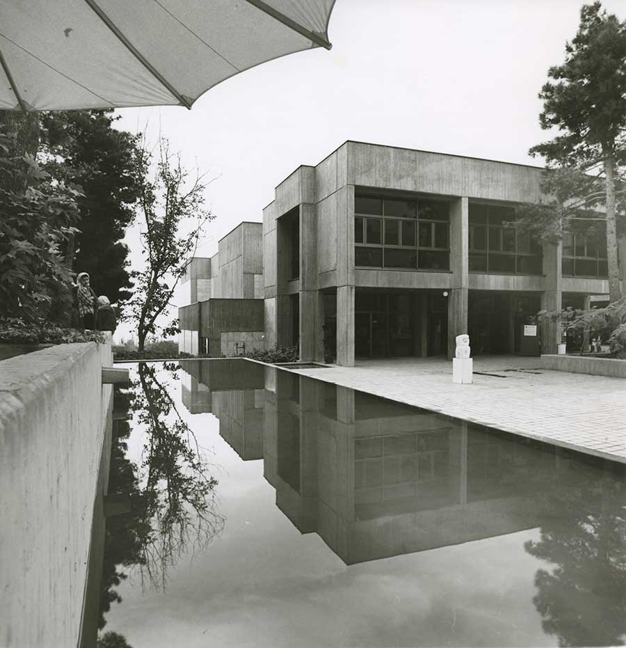 The idea here was to create diversity and a comprehensible scale by treating theater, gallery, library and restaurant as independent units. All the buildings faced a common courtyard which was connected to the axis of cascading pools and tall plane trees. As one crosses a moat by a narrow bridge to gain access to the sunken courtyard, one is framed and announced by the small entrance gate.