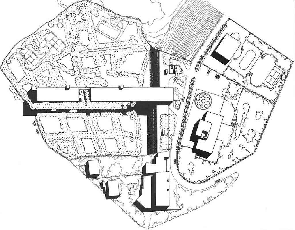 In the small valleys of Elahiyeh and the foothills of the Alborz Range north of Tehran, lie many lush gardens hidden behind gentle slopes. Our commission was a high-rise apartment building. We tried to save most of the trees and observe three-story height limitations above the hill tops.