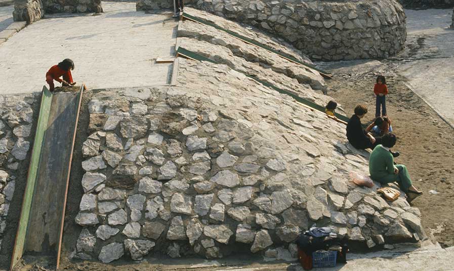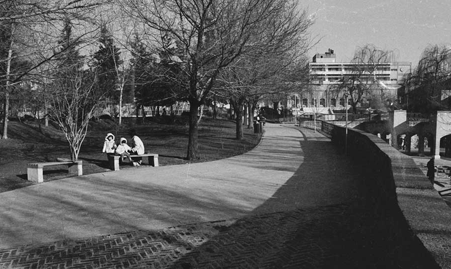The graded, multilevel plaza gradually levelled down to the sunken playground, a movement accentuated by the sound and sight of a waterfall. To energize the space with activity, all pathways led to the plaza. For the finishing touch I commissioned the Iranian sculptor, Parviz Tanavoli, to do three bronze figures which are quite reminiscent of the works of George Segal. In the context of a real-life situation, they are located in a public space, meant to be identified, touched and befriended by the passers-by.