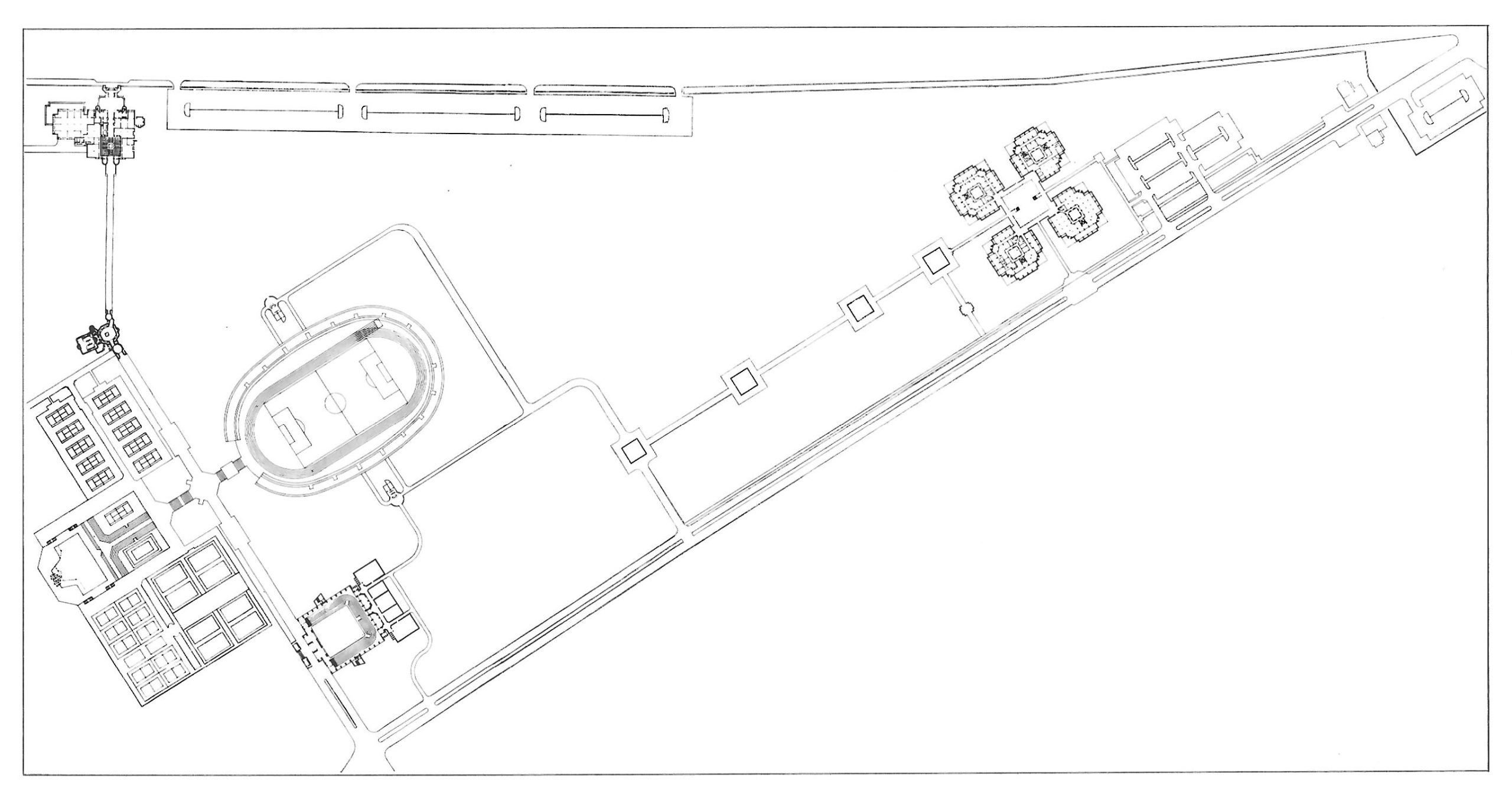 Before building the large gymnasium, we made indoor sports halls and locker rooms, as indicated, to the north of the gymnasium. This building is contemporary to the mosque and student union. At a later date, when we were given the commission for the large stadium, we decided to place it at the south end of the east-west walkway. However, the chancellor of the university forced us to locate it at the north end, which meant painful destruction of the main entrance facade of the sports hall and its integration into the larger structure.