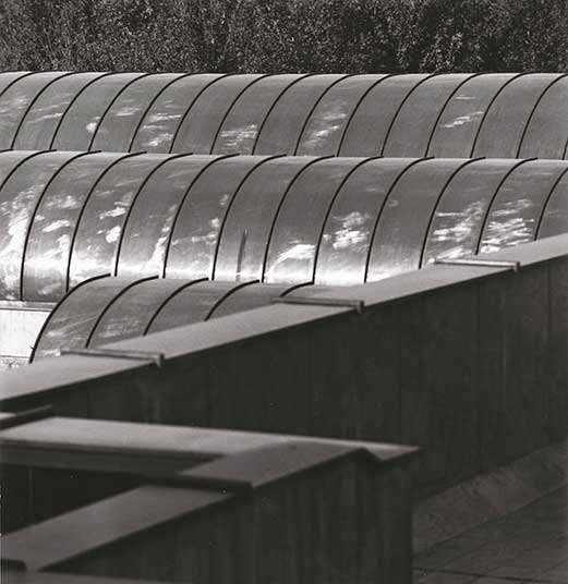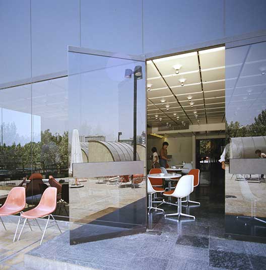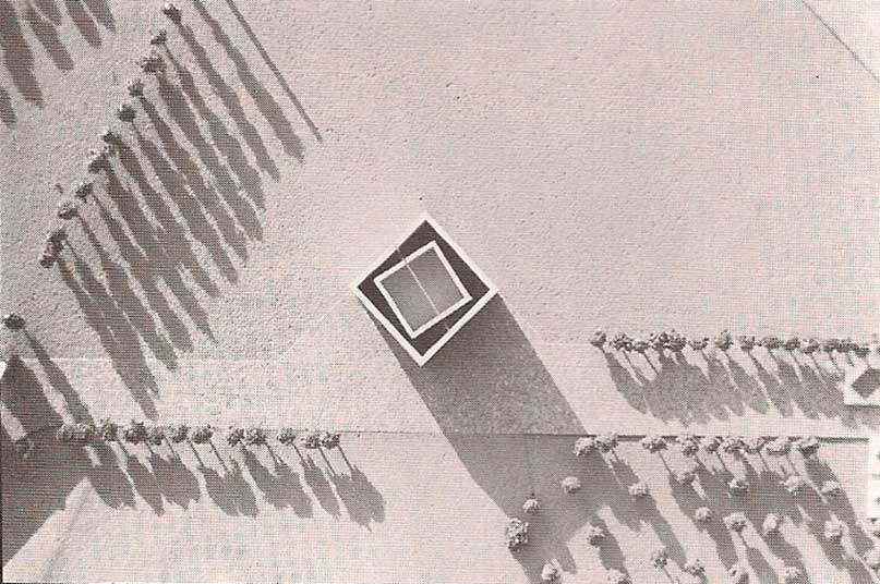 As the galleries along the large circulation romp move earthward, the roof of the last gallery finally meets the entrance level. The snack-bar and outdoor seating area on top of it become part of the courtyard, commanding a view of the greenery of Farah Park. This feature opens the roof of the galleries for outdoor use. Spectators, after completing a tour of the building, then discover the rare opportunity to experience the galleries from floor to rooftop.